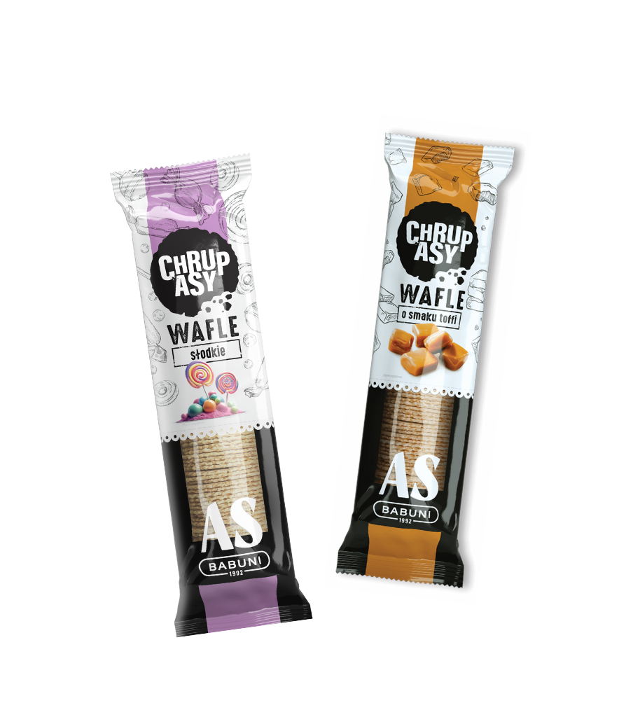 Wafle wypiekane z mąki pszennej. Delikatne i chrupiące, słodzone wyłącznie naturalnym cukrem i bez dodatku konserwantów. Występują w 2 wyśmienitych smakach: toffi oraz słodkie.
